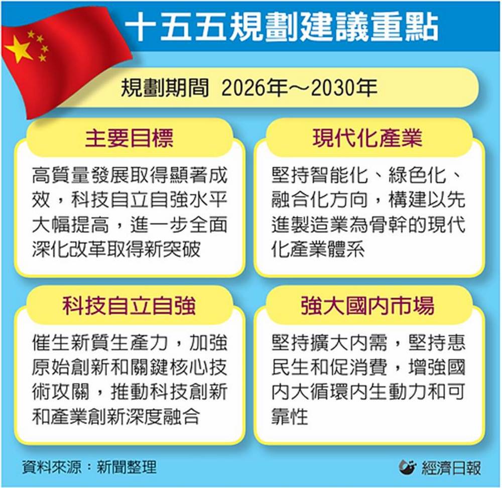 《經濟日報》10月24日台北訊,中共20屆四中全會昨(23)日閉幕,審議通過關於「十五五(2026-2030年)」規劃的建議,列出「十五五」時期經濟社會發展的主要目標,包括高品質發展取得顯著成效,科技自立自強水準大幅提高,進一步全面深化改革取得新突破,加強原始創新和關鍵核心技術攻關。
