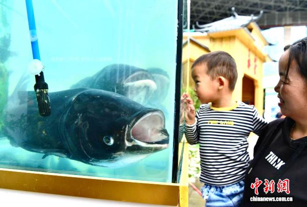 圖為展示的三明大金湖有機魚吸引小朋友。中新社記者 張斌 攝