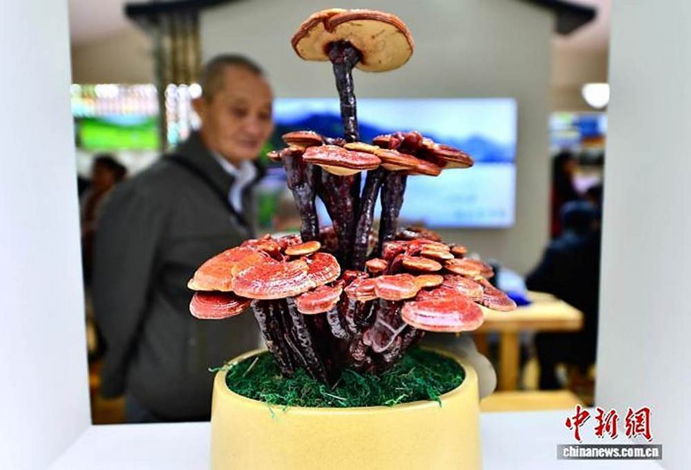 圖為展會上企業展示種植的即可以食用又可以當作盆栽的靈芝。中新社記者 張斌 攝