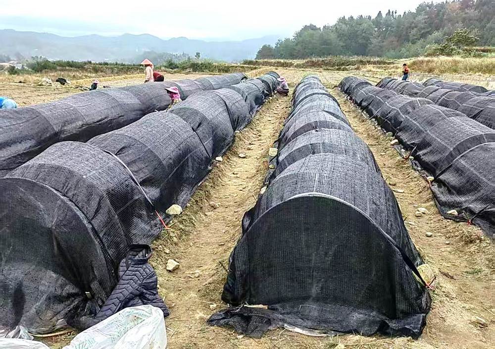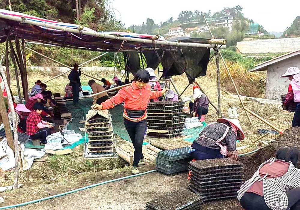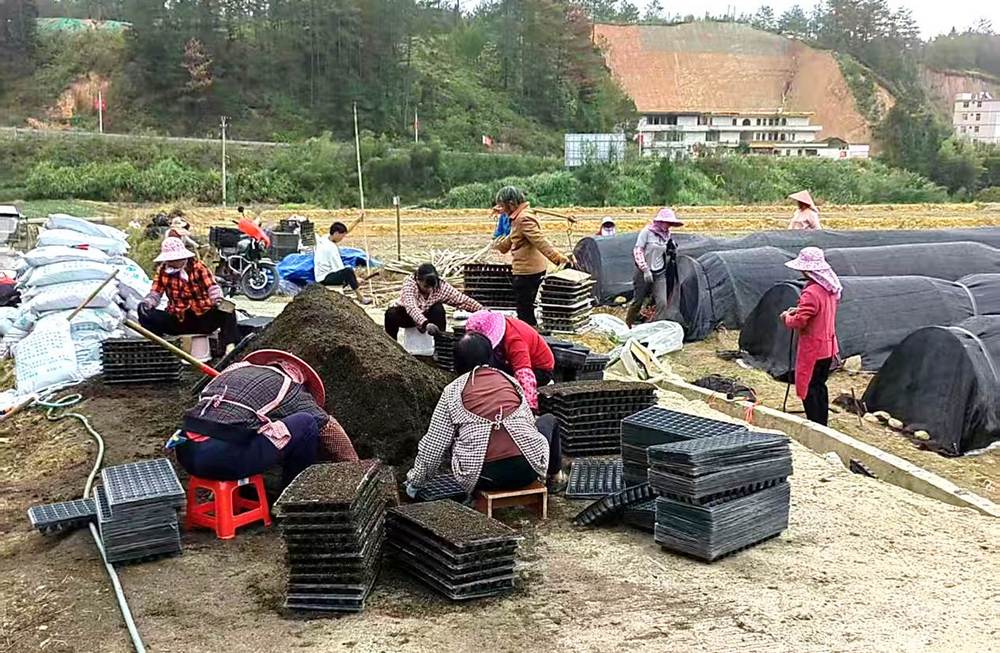 在位於上杭台青農場的《才溪育苗場》辣椒種植基地,山間地頭呈現出一派繁忙景象。一片片地膜宛如白雪覆蓋了大地,這是為辣椒生長精心鋪設的“保溫毯”。工人們分散在地塊間,默契地配合著工作,科學的良種良法讓他們的工作效率極高,打孔、放苗、填土、澆水,每一個動作都嫺熟而俐落,各司其職,有條不紊。不一會兒,地上便栽滿了排列整齊的辣椒苗。