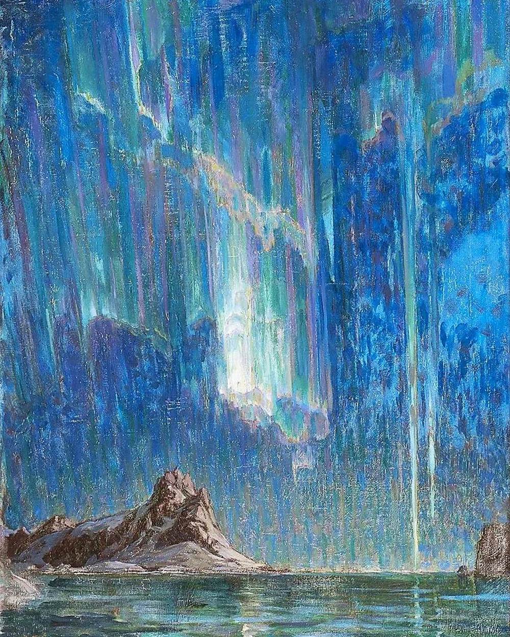 圖像加註文字,瑞典藝術家安娜‧博貝里(Anna Boberg)於20世紀初在挪威的洛佛敦群島創作了這幅極光研究畫作。