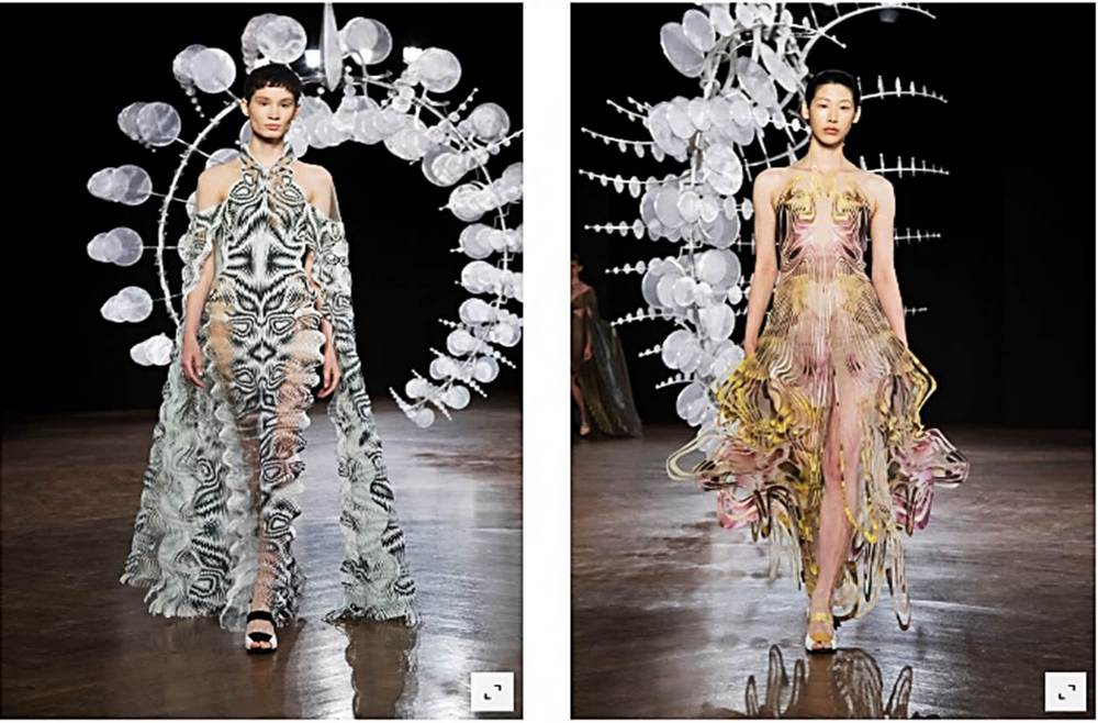 就有如模特兒身後名為「Omniverse」的風力藝術裝置,整場秀動感意象十足。Iris van Herpen藉由複雜的閃光面料,聚酯薄膜和透明薄紗堆疊,營造出「Hypnosis」(催眠)服飾線條錯視感,當形體一擺動,就像是水流般起漣漪波動,與身體融合然後漸漸縹緲消失,充滿破壞性又脆弱感,如同大自然的奇幻美感,正是她此次想傳遞的。全新系列創作除了有與長期合作的建築藝術家Philip Beesley合作之外,她也嘗試了使用日本墨流藝術技法(Suminagashi),讓織物上的圖紋呈現獨一無二的流線之美。