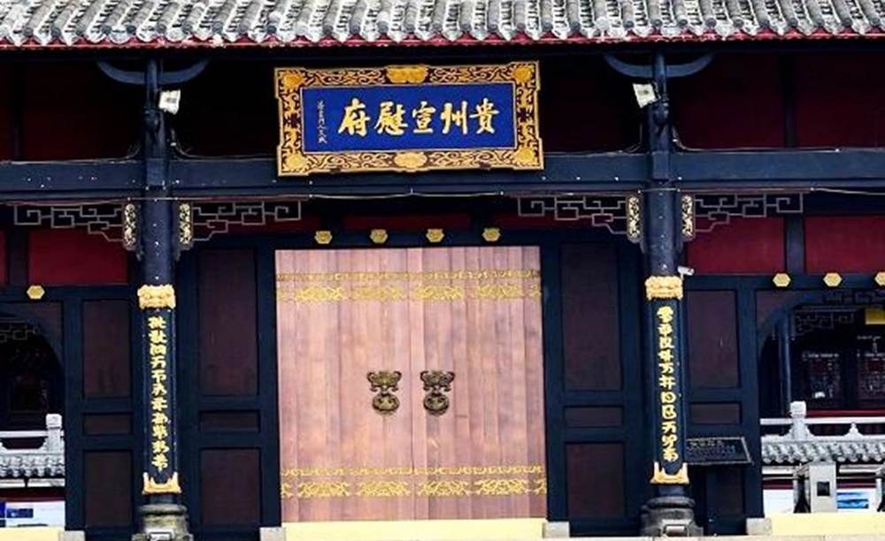 走過這座石橋,就來到了貴州宣慰府的正門,貴州宣慰府正殿上方鑲嵌著的「貴州宣慰府」5個金色大字系當代著名書畫大家劉海粟的得意門生謝天成題寫。