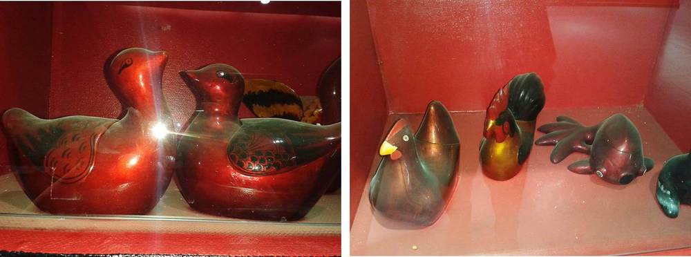 彝族漆器民族風格特別突出,除碗、勺、盆等日常生活用具,還有鷹爪杯、雁爪杯、牛角杯和野豬蹄杯等造型獨特的飲酒器皿。這些酒器直接取材于自然物體,磨制彩繪而成,古樸自然,造型不凡。