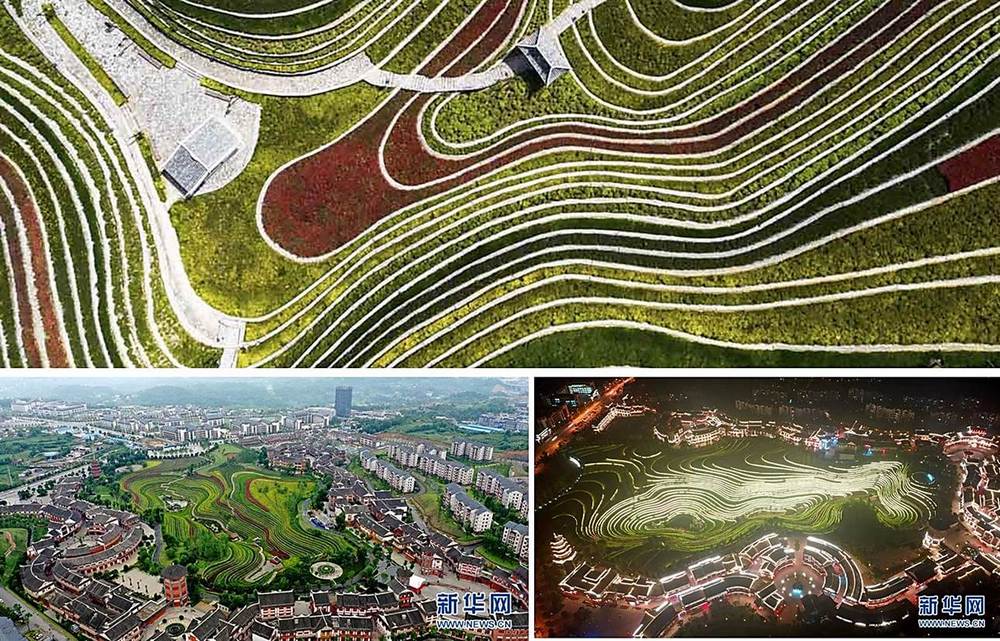 大方縣奢香古鎮是大方縣易地扶貧搬遷安置區,規劃建設時,在古鎮中心建設了12萬平方米的「城市梯田」,種植玫瑰花等觀賞類植物,發展農旅結合的鄉村觀光旅遊。通過新華網無人機鏡頭俯瞰,夏日的奢香古鎮梯田綠意盎然,層次分明,相連的梯田線條宛如「大地指紋」,呈現出迷人景致。
