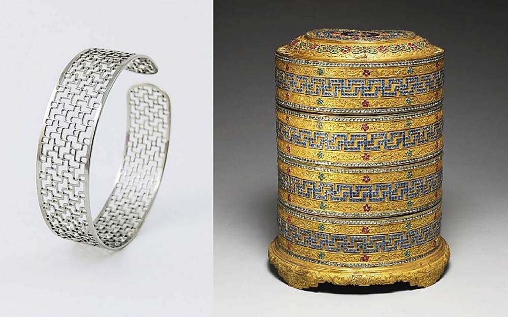 圖/萬壽無疆手環,取材自故宮典藏「清 鎏金嵌料花卉卍字紋套盒」,將有長壽寓意的卍字不斷紋以現代材質設計成手環。(故宮提供)