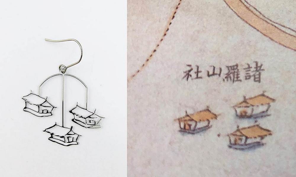 圖/三間小屋耳環,取材自故宮典藏「清 乾隆臺灣輿圖」,將台灣古地圖上古樸建築物設計成耳環及項鍊。(故宮提供)