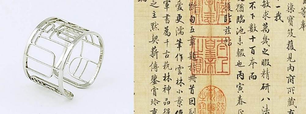 拿起另一款在故宮展售的項鍊綴飾,細如髮絲的線條構成了「太上皇帝之寶」字樣。來自晉王羲之「快雪時晴帖」的古印文字,幾乎被金屬還原。第一次觸摸的人難免戰戰兢兢:鋼線如此細,難道不會斷嗎?